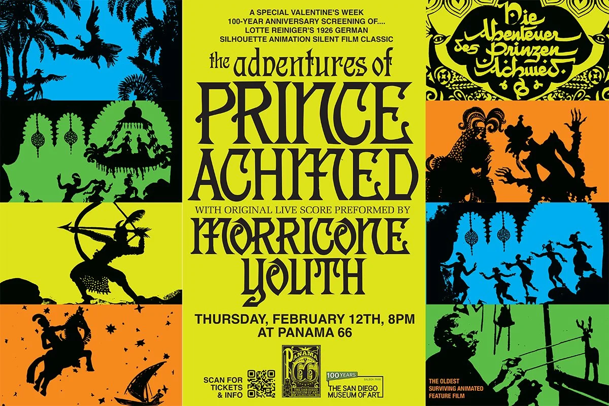 PANAMA 66 presents a special one-night, family-friendly, Valentine's Week screening of Lotte Reiniger’s 1926 German silhouette animation silent film "THE ADVENTURES OF PRINCE ACHMED," the oldest surviving feature length animated film on its 100th anniversary year, with a live score by NYC's MORRICONE YOUTH in the Copley Auditorium at the San Diego Museum of Art. This will be a general admission seated show.
