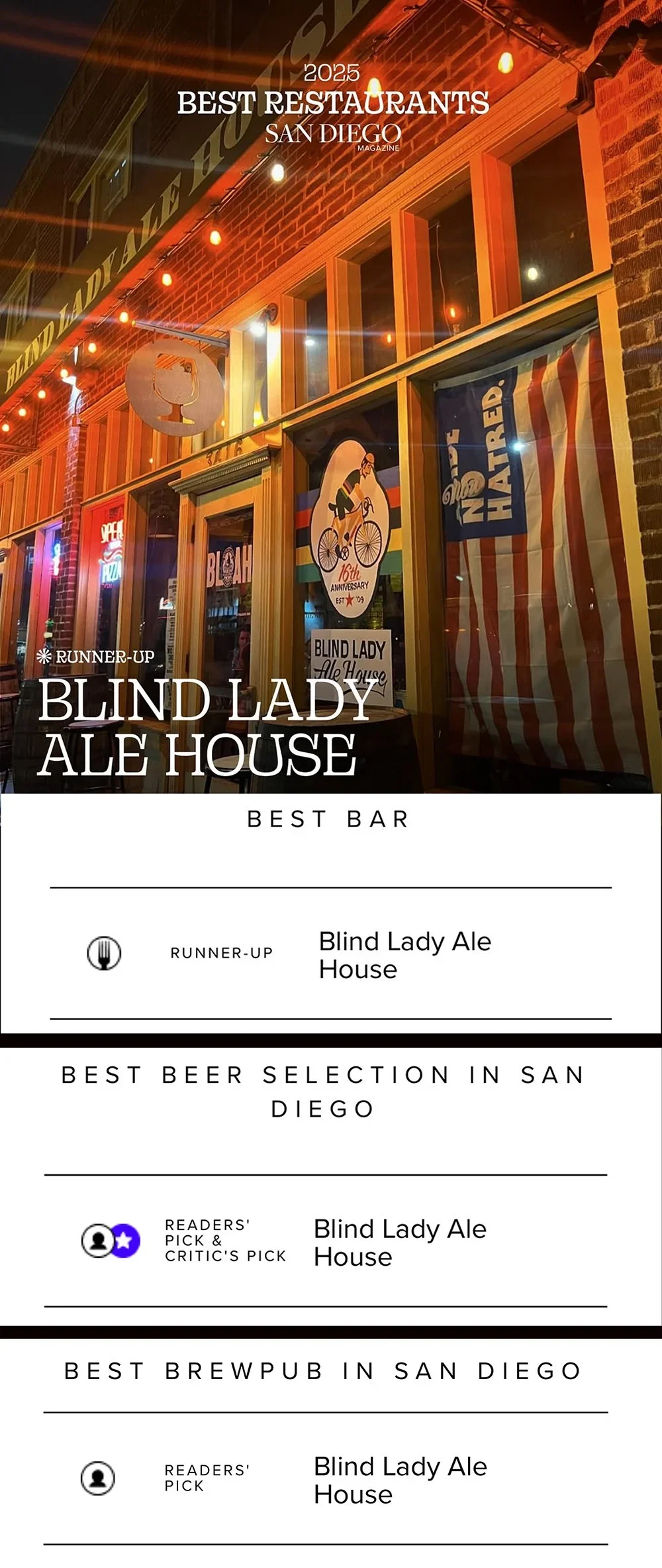 Visit our original location. Blind Lady Ale House, also known as BLAH, is located in Normal Heights only a few miles from P66. BLAH has been honored as one of the 100 Best Places to Drink Beer in America by Draft Magazine. We offer indie beer, draft wine and craft pizzas.